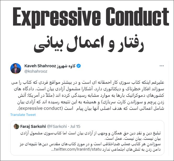 رفتار و اعمال بیانی کاوه شهروز در توییت امروز خود و در پاسخ به فردی که کتاب سوزاندن را علیه آزادی بیان میداند پاسخ داده و از قانون دیگری در رابطه با آزادی بیان سخن میگوید. https://twitter.com/kshahrooz/status/1680590033626046469 کاوه من را برانداشت که به دنبال چنین مبحثی بگردم که دوست دارم دیگران را نیز در جریان آموخته های خود قرار دهم. سانسور- حذف - خفقان هییت مدیره تحت ریاست بیژن احمدی و هییت مدیره کنونی طبق برداشت خود از حقوق و وظایفی که اعضاء به آنها محول کرده اند بهره گرفته و مانع آزادی بیان و اعمال من و دیگران میگردند. - مانع از انتشار ویدئو میگردند. - از مشارکتدر فعالیت های کنگره ممانعت به عمل میاورند - از تمدید عضویت خودداری میکنند - از شرکت در انتخابات محروم میسازنند - بیژن احمدی کلن به مدت پنج سال فوروم کنگره را برای اعضاء از کار میاندازد و هییت مدیره فعلی مطالب را سانسور و به دفعات افراد را برای ۳۰ روز ممنوع الکلام میسازد. - رئیس سابق کنگره به دفعات اخطار های قانوی میفرستد و در دادگاه پرونده تشکیل میدهد - رئیس کنونی کنگره به افراد و خانواده هایشان تهمت وابستگی به مجاهدین میزند وحشت ما از آزادی بیان برای چیست؟ در کشوری آزاد و دموکراتیک مانند کانادا آیا واقعن میتوان مانع از آزادی بیان کسی شد؟ وحشت ما از آزادی بیان برای چیست؟ مگر نه اینکه به خاطر آزادی، امنیت، آزادی بیان و دموکراسی ترک سر زمین مادری کرده ایم؟ پس چرا جو خفقان، نا امنی، بی اعتمادی و وحشت برای خود و دیگران بوجود میاوریم. با تشکر از کاوه شهروز که فرصتی بوجود آورد که من به مهمترین پدیده زندگی ام یعنی آزادی بیان بپردازم. از آنجاییکه ممکن است از این مطلب در دادگاه علیه من استفاده کنند آنرا در اولین فرصت به انگلیسی ترجمه خواهم کرد که زحمت آنها کمتر گردد.