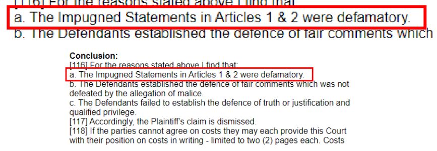 دو متن آی سی ژورنال افترا و توهین و تهمت بوده است. اگر حکم قاضی غیر از این بوده لطفن تذکر دهید. حال که دادگاه تمام شده، متوجه نمیشوم که این چه اصراریست که وقایع را وارونه نشان دهیم. قاضی دو متن آی سی ژورنال را توهین و تهمت اعلام کرده است. توهین و تهمت نیز در قوانین کانادا جرم نیست. فقط اگر باعث خسارت و لطمه به شهرت و خوشنامی کسی شود، باید خسارات آن پرداخت گردد.