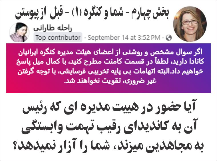 بخش چهارم – شما و کنگره (۱) – قبل از پیوستن ۱- دلیل عدم علاقه و حضور شما به کنگره، از زمان اضافه کردنتان به گروه لتس تاک آی سی سی در سال ۲۰۱۴ توسط ارسلان کهنمویی پور تا زمان پیوستنتان به هییت مدیره در جولای ۲۰۲۳ چه بوده است؟ ۲- آیا از آن زمان به بعد از آنچه که در این نهاد میگذشت با خبر بودید؟ آیا فعالیت های کنگره را دنبال میکردید؟ آیا از سراسری شدن کنگره در سال ۲۰۱۸ مطلع شدید؟ ۳- آیا در جریان اقدامات قانونی علیه آخرین هییت مدیره قبل از سراسری شدن کنگره بودید؟ آیا قبل از پیوستن به هییت مدیره اعتراف به خطا های صورت گرفته در توافق نامه ای که زیر نظر دادگاه تنظیم شده بود را مطالعه کرده بودید؟ آیا در جریان این توافق نامه هستید؟ ۴- دلیل عدم پیوستن شما به کنگره و شرکت در اولین انتخابات سراسری که بصورت استثنانی و زیر نظر دادگاه و با هیاهوی بسیار اجرا گردید چه بود؟ ۵- چه کسی از شما دعوت نمود که در انتخابات ۲۰۲۳ به کنگره بپیوندید؟ آیا از خود نپرسیدید که دلیل دعوت از شما چیست؟ آیا در جریان بودید که در آنزمان در اذهان عمومی، هییت مدیره های آندوره همسو خوانده میشدند؟ آیا در صحت و یا عدم صحت این مورد بررسی هایی را انجام دادید؟ به چه نتایجی رسیده اید؟ ۵- آیا از تعداد اعضای کنگره در سال ۲۰۲۰ که حدود نفر۳۵۰۰ بود مطلع بودید؟ آیا از ریزش تعداد اعضاء از ۳۵۰۰ به ۲۸۴ نفر در زمان پیوستن شما تعجب نکردید؟ آیا جویای علت آن شدید؟ به چه نتایجی رسیدید؟ ۶- از اینکه در انتخاباتی شرکت میکردید که رقابتی در آن نبود و چهار کاندیدا از جمله خود شما شرط یکسال عضویت را نداشتید برایتان سئوال برانگیز نبود؟ جویای دلایل آن شدید؟ انتخابات فرمایشی و غیر منتخب بودن در یک نهاد دموکراتیک شما را آزار نمیدهد؟ ۷- در جلسه معرفی کاندیدا ها که شما هم در آن حضور داشتید، در رابطه با تهمت وابستگی به مجاهدین زدن آرزو خدیر، نایب رئیس کنگره به یکی از کاندیدا های رقیب در انتخابات ۲۰۲۰ سئوالاتی مطرح گردیدند. آرزو خدیر در آن جلسه به عنوان یکی از ۷ کاندیدا برای دوره دوساله دوم حضور داشت ولی سکوت اختیار میکند. آیا این باعث تعجب شما نشد؟ آیا با حضور در هییت مدیره ای که رئیس آن به رقبای انتخاباتی خود تهمت وابستگی به مجاهدین میزند مشکلی ندارید؟ آیا بعد از آن جویای این مورد شدید؟ چه پاسخی دریافت کردید؟ ۸- در پاسخ به سئوال رئیس وقت کنگره، مسلم نوری، در رابطه با دلایل پیوستن شما به کنگره، به سه مورد، بیانیه ها، موضع گیری ها و اساسنامه کنگره اشاره نمودید. لطفن توضیح دهید که منظور شما کدام بیانیه و چه مواضعی بود؟ بیانیه در رابطه با تحریم ها؟ موضع گیری در مواردی که به جمهور اسلامی مربوط میگردند؟ آیا طبق اساسنامه کنگره ایرانیان یک نهاد غیر سیاسی نیست؟