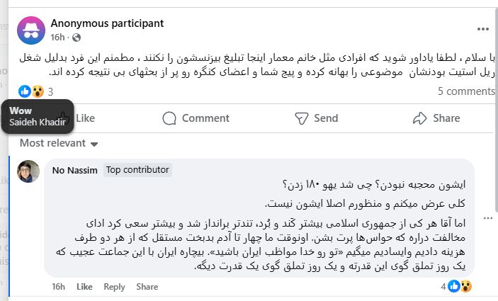 خیلی ممنون از شما. پس جریان این است ! · 17h ایشون محجبه نبودن؟ چی شد یهو ۱۸۰ زدن؟ کلی عرض میکنم و منظورم اصلا ایشون نیست. اما آقا هر کی از جمهوری اسلامی بیشتر کَند و بُرد، تندتر برانداز شد و بیشتر سعی کرد ادای مخالفت دراره که حواسها پرت بشن. اونوقت ما چهار تا آدم بدبخت مستقل که از هر دو طرف هزینه دادیم وایسادیم میگیم «تو رو خدا مواظب ایران باشید». بیچاره ایران با این جماعت عجیب که یک روز تملق گوی این قدرته و یک روز تملق گوی یک قدرت دیگه. · 16h So dangerous when politics becomes opportunistic and Buisness! · 15h