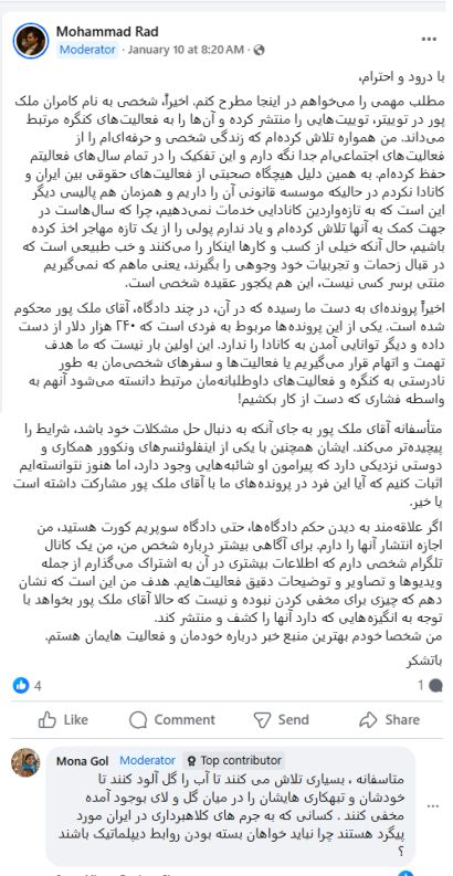| Mohammad Rad | با درود و احترام، مطلب مهمی را میخواهم در اینجا مطرح کنم. اخیراً، شخصی به نام کامران ملک پور در توییتر، توییتهایی را منتشر کرده و آنها را به فعالیتهای کنگره مرتبط میداند. من همواره تلاش کردهام که زندگی شخصی و حرفهایام را از فعالیتهای اجتماعیام جدا نگه دارم و این تفکیک را در تمام سالهای فعالیتم حفظ کردهام. به همین دلیل هیچگاه صحبتی از فعالیتهای حقوقی بین ایران و کانادا نکردم در حالیکه موسسه قانونی آن را داریم و همزمان هم پالیسی دیگر این است که به تازهواردین کانادایی خدمات نمیدهیم، چرا که سالهاست در جهت کمک به آنها تلاش کردهام و یاد ندارم پولی را از یک تازه مهاجر اخذ کرده باشیم، حال آنکه خیلی از کسب و کارها اینکار را میکنند و خب طبیعی است که در قبال زحمات و تجربیات خود وجوهی را بگیرند، یعنی ماهم که نمیگیریم منتی برسر کسی نیست، این هم یکجور عقیده شخصی است. اخیراً پروندهای به دست ما رسیده که در آن، در چند دادگاه، آقای ملک پور محکوم شده است. یکی از این پروندهها مربوط به فردی است که ۲۴۰ هزار دلار از دست داده و دیگر توانایی آمدن به کانادا را ندارد. این اولین بار نیست که ما هدف تهمت و اتهام قرار میگیریم یا فعالیتها و سفرهای شخصیمان به طور نادرستی به کنگره و فعالیتهای داوطلبانهمان مرتبط دانسته میشود آنهم به واسطه فشاری که دست از کار بکشیم! متأسفانه آقای ملک پور به جای آنکه به دنبال حل مشکلات خود باشد، شرایط را پیچیدهتر میکند. ایشان همچنین با یکی از اینفلوئنسرهای ونکوور همکاری و دوستی نزدیکی دارد که پیرامون او شائبههایی وجود دارد، اما هنوز نتوانستهایم اثبات کنیم که آیا این فرد در پروندههای ما با آقای ملک پور مشارکت داشته است یا خیر. اگر علاقهمند به دیدن حکم دادگاهها، حتی دادگاه سوپریم کورت هستید، من اجازه انتشار آنها را دارم. برای آگاهی بیشتر درباره شخص من، من یک کانال تلگرام شخصی دارم که اطلاعات بیشتری در آن به اشتراک میگذارم از جمله ویدیوها و تصاویر و توضیحات دقیق فعالیتهایم. هدف من این است که نشان دهم که چیزی برای مخفی کردن نبوده و نیست که حالا آقای ملک پور بخواهد با توجه به انگیزههایی که دارد آنها را کشف و منتشر کند. من شخصا خودم بهترین منبع خبر درباره خودمان و فعالیت هایمان هستم. باتشکر |
