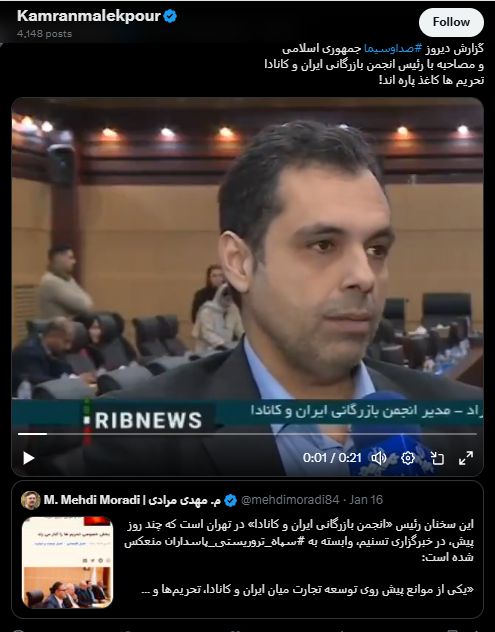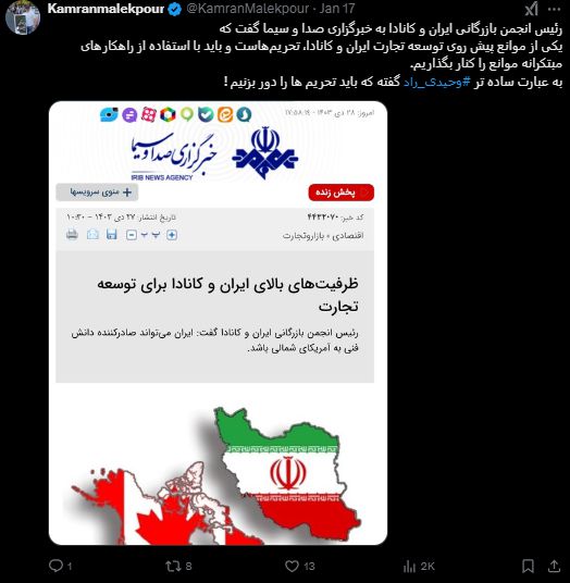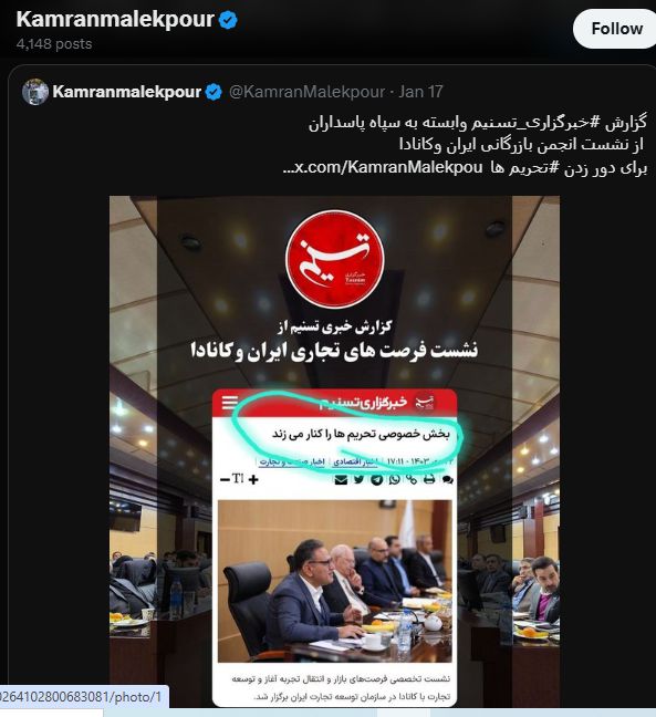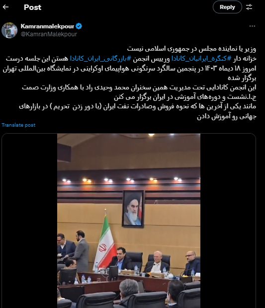 | https://x.com/KamranMalekpour/status/1880257240290173129 محمد وحیدی راد - انجمن بازرگانی ایران و کانادا - دور زدن تحریمها | ||||