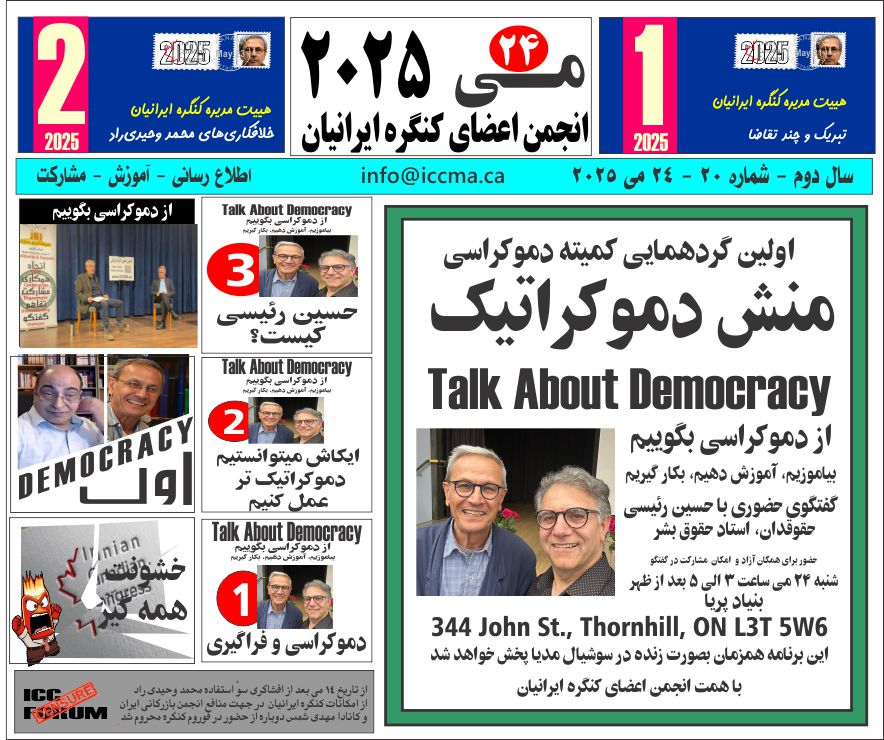 | 2 | Saeed Soltanpour | جلسه ای در مورد دمکراسی مهدی شمس و حسین ریسی در بنیاد پریا، تورن هیل، انتاریو بیشتر بحث د رمورد کنگره ایرانیان کانادا بود، سخنران، گفت زیاد به مسایل کنگره احاطه نداره و بهتره خود کنگره سوالات را پاسخ بدهد شنبه ۲۳ مه ۲٠۲۵ |